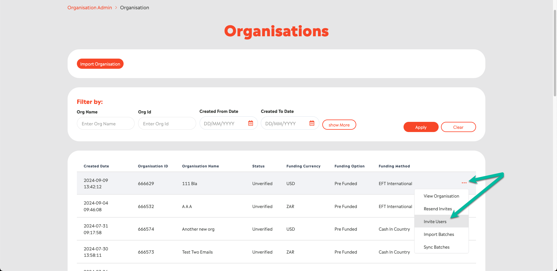 Once an Organisation is imported on EPP, they will be displayed in the Organisation list; from here you will be able to access Organisation specific options such as Inviting the Org Admin (since Organisations will manage their own users, only Org Admins would need to be invited). To access the Invite Org Admin option, click on the ellipses next to the Organisation: