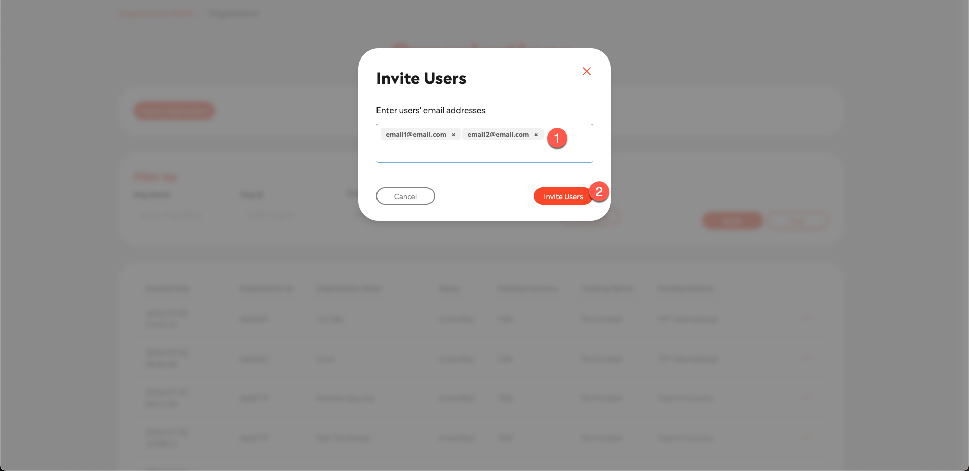This will open the Invite Org Admin pop-up, where you can enter the email address(es) [1] of the users (comma separate the email addresses to invite more than one person) who will be assigned the Organisation Admin role for the Organisation; select Invite Users [2] to send the invites: