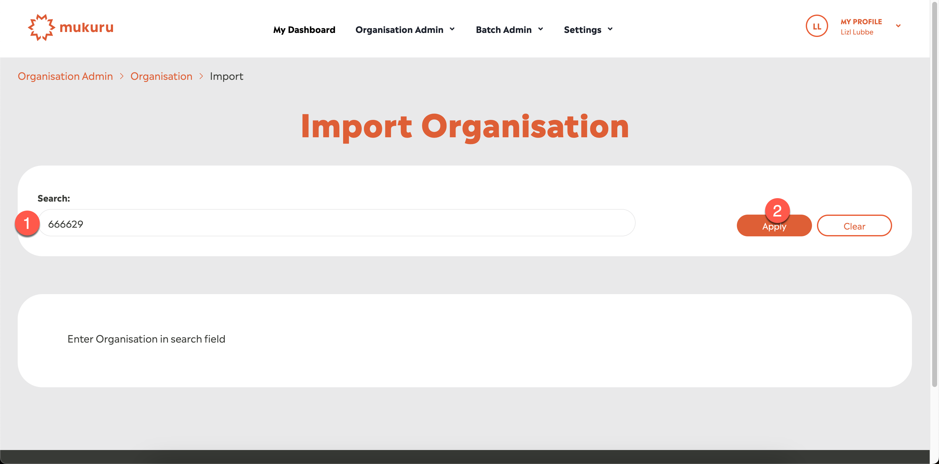 To import an Organisation, enter their Valtari User ID in the Search box [1] and click Apply [2]: