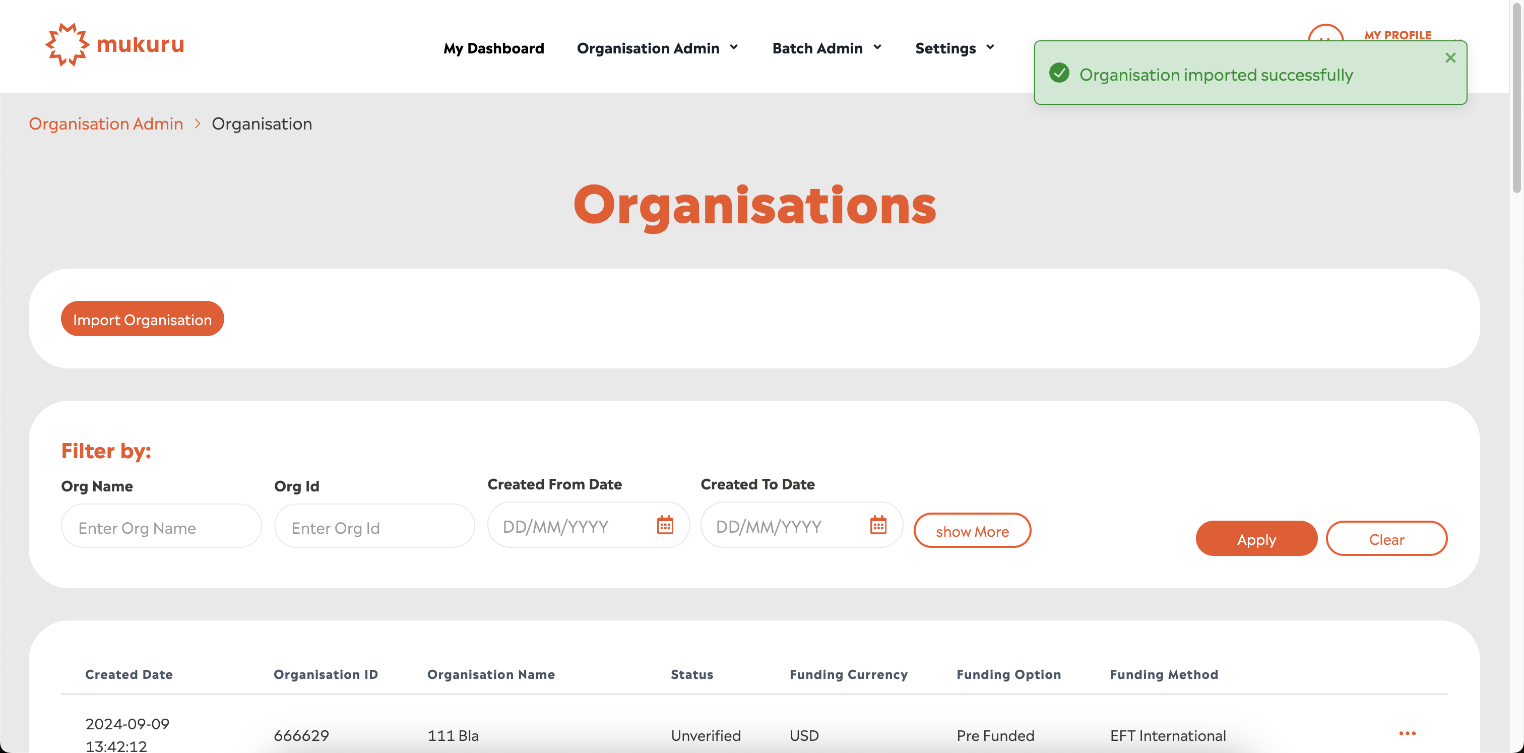 The following screen will be displayed when the Organisation is successfully imported: