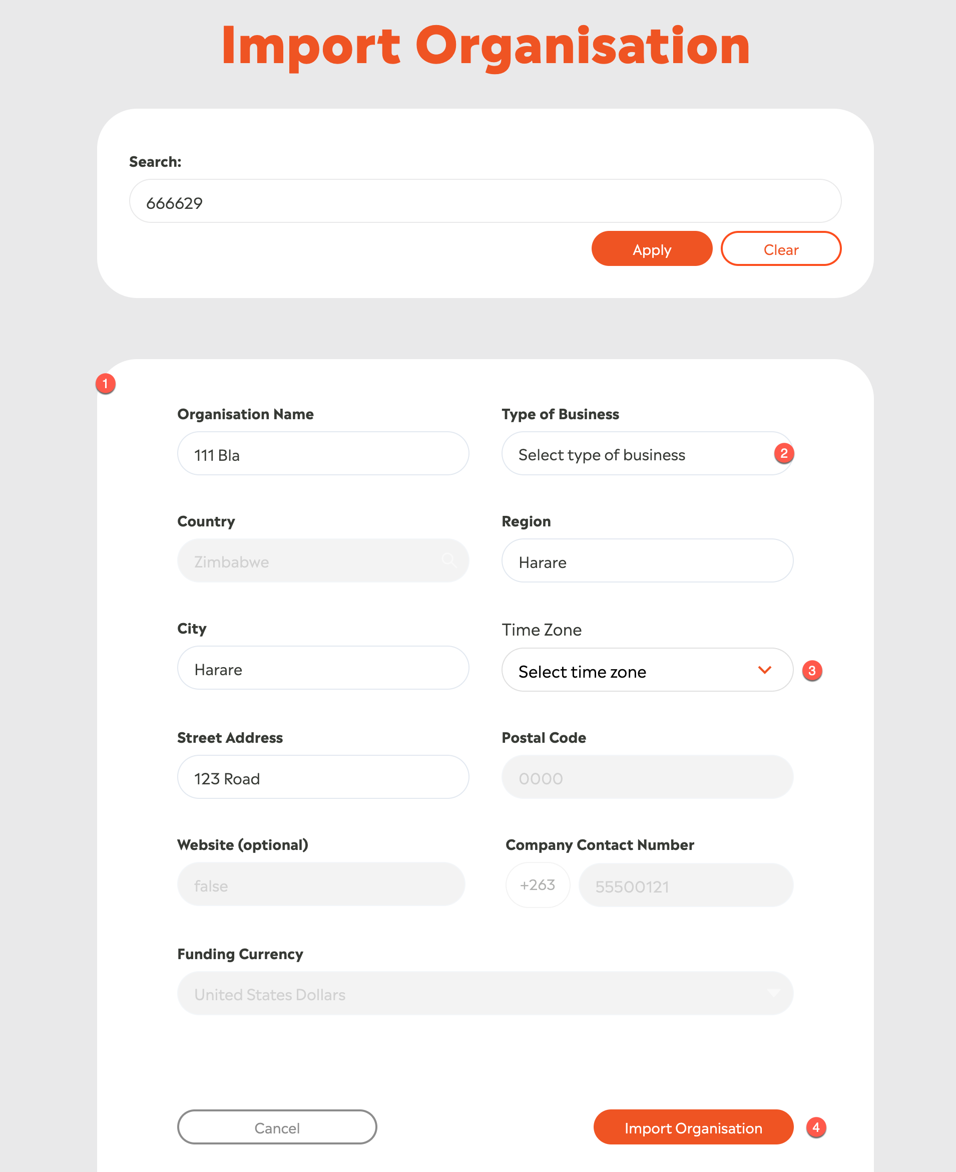 The Organisation information will be pulled from Valtari and displayed the form below [1]; some additional information for EPP needs to be completed including the Type of Business [2] and the Time zone [3]. Once this is done, click Import Organisation [4] to import the Organisation to EPP:
