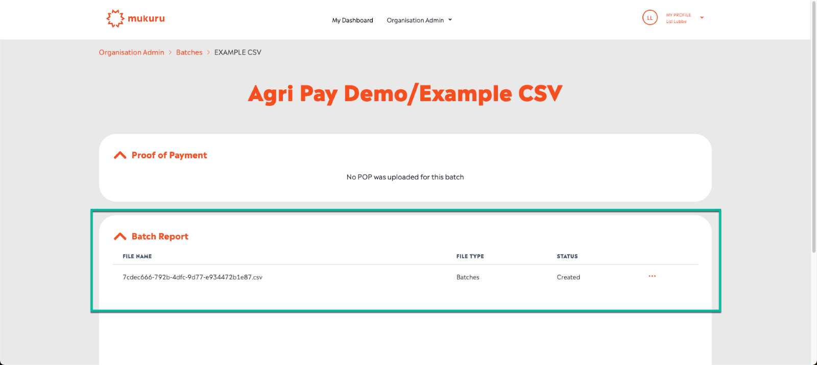 Example of the Created Batch with CSV; a Team Lead user can download the file by clicking on the Download menu option (behind the ellipses).