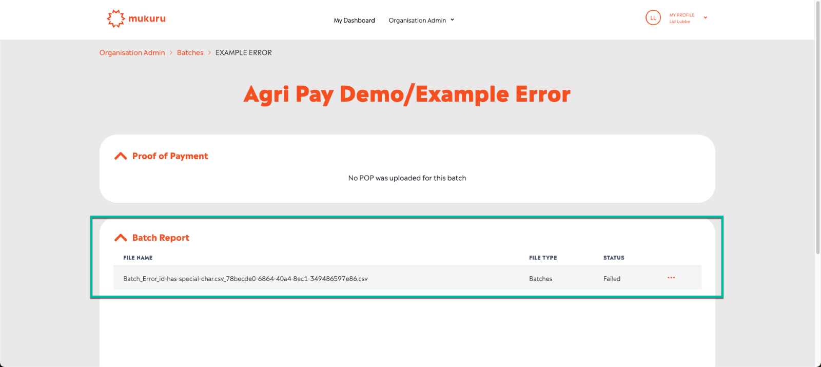 Example of the Failed Batch with Batch Error Report; a Team Lead user can download the file by clicking on the Download menu option (behind the ellipses).