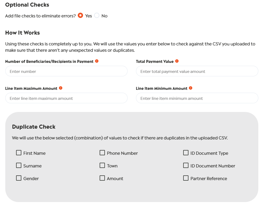 - Duplicate Check: This is to ensure that there are no duplicates in the CSV file, based on your selection of the fields that are supposed to be unique. Each record in the CSV will be scrutinised against the selected fields (as a group), and if there is more than one record where the selected fields have the same value, the payment creation will be blocked.