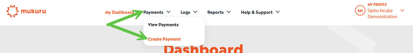 To create a payment, navigate to the Create Payment function in the Payments menu: