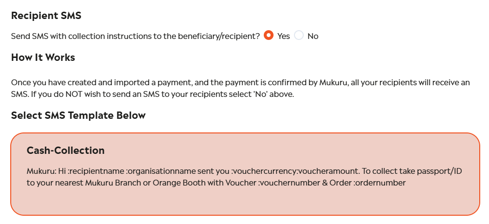 8. For payments where the transactions are for cash to be collected, you have the option of selecting the SMS template that will be sent to the recipient. This SMS will contain the necessary information the recipient needs to collect the cash, and is enabled by default: