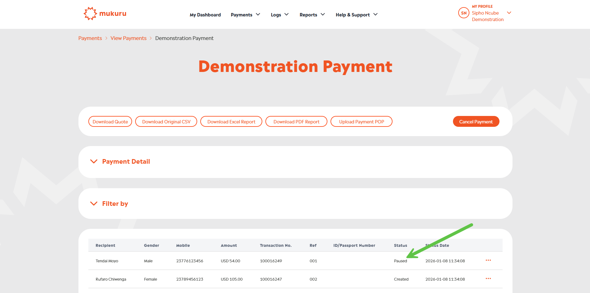 When a transaction is in a Paused status, Mukuru needs a copy of the recipient’s ID document to investigate the matter further. When you have Paused transactions in a payment please send the details of your Organisation, the payment in question and copies of the affect recipient’s ID documents to enterprisesupport@mukuru.com. The Enterprise Support team will then send the request to the applicable Mukuru team and inform you of any updates and results.