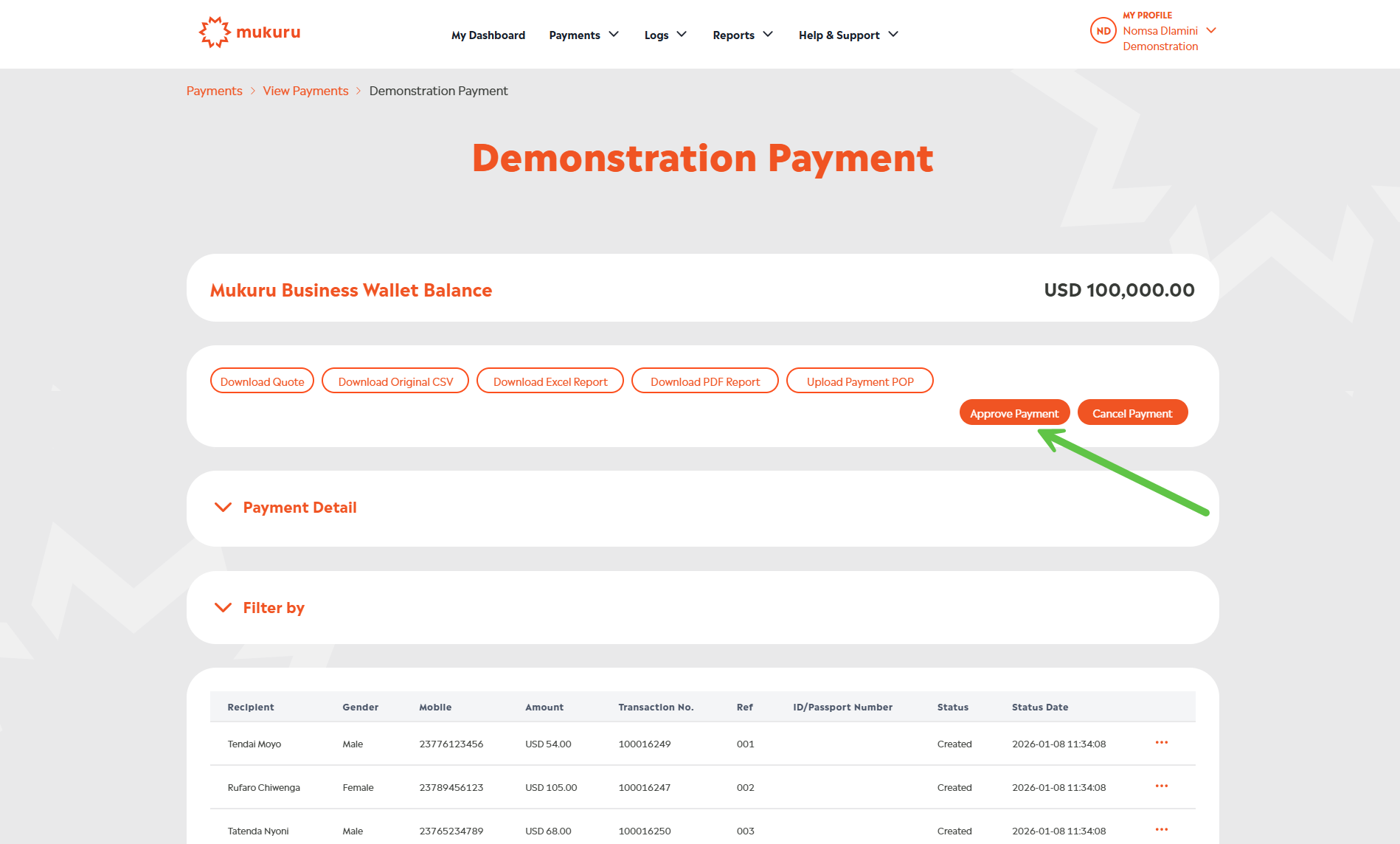 Please note that Mukuru does not take payment for transactions in a Paused status. If you Approve Payment for a payment with one or more Paused transactions, the amount deducted will exclude the amount(s) for the Paused transaction(s). You will only be able to Approve Payment for these transactions after the transactions have been whitelisted. Once Enterprise Support informs you that the investigation was concluded, and the transaction is whitelisted you can click on the Approve Payment button again, this will only deduct the funds for transactions that are in a Created status, i.e. the transactions that were whitelisted.