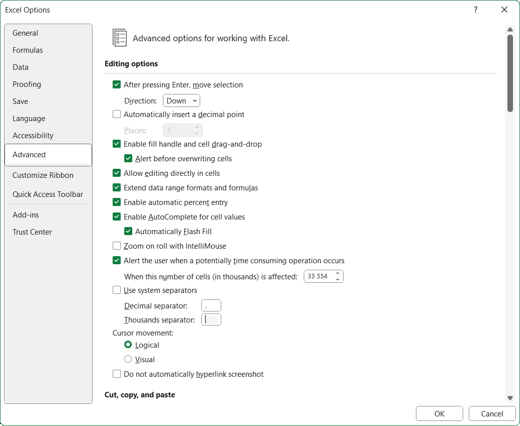 When saving your Excel file as a .csv file, click on File, then Options, then Advanced to get to Edit Options. Under Edit Options you want to clear the checkbox next to “Use system separators”, set the “Decimal separator” to a period (.), set the “Thousands separator” to a comma (,) and click OK to save: