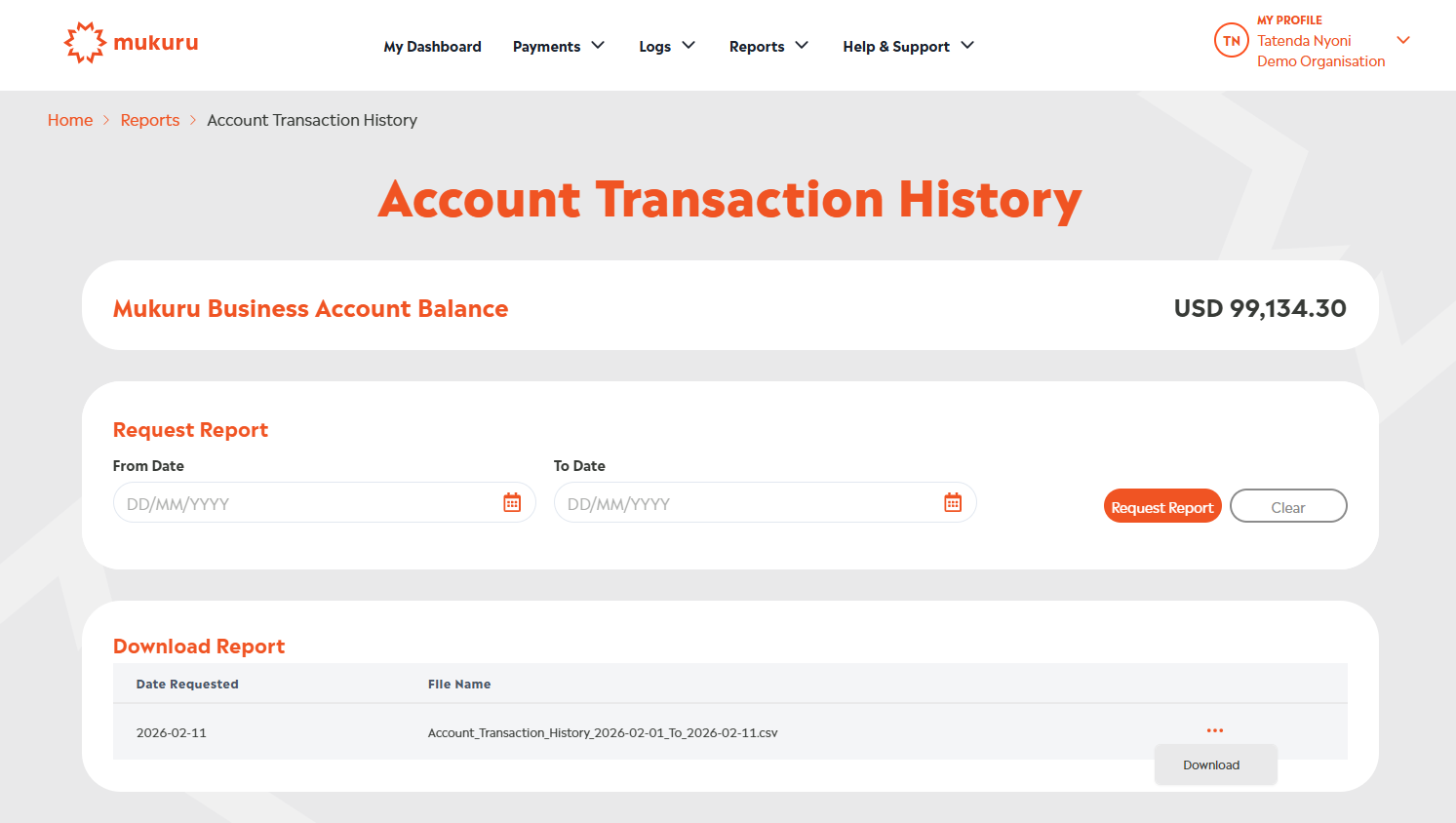 Finance and Finance Support users can request and access Account Transaction History Reports. This report